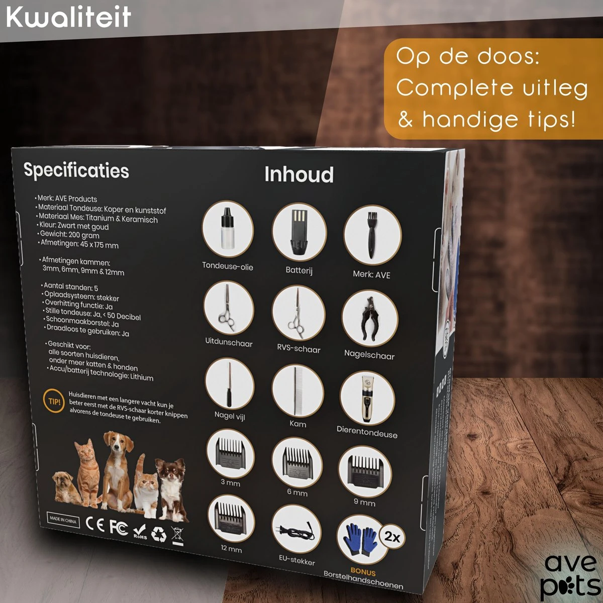 Verzorg het dan goed met deze volledige set! Deze verzorging set bevat onder andere de AVE Pets Dierentondeuse die oplaadbaar, draadloos, krachtig en toch heel stil is en daarnaast ook nog heel gemakkelijk schoon te maken! Maar dat is zeker niet het enige, lees hieronder verder!