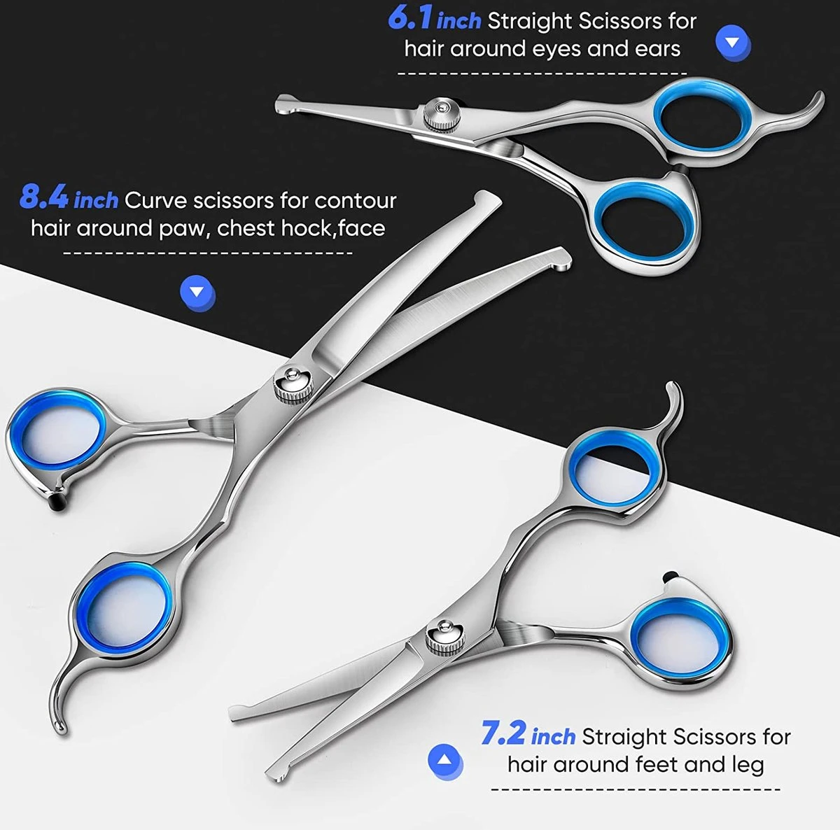 【Professionele 6 in 1 Set 】Koop 1 set krijg 6 grooming tools, onze huisdier grooming set bevat rechte schaar x 2, trimschaar x 1, buigschaar x 1, borstelige en losse kam x 1, en mooie rits opbergdoos x 1. Een set voor het verzorgen van het hele lichaam van uw geliefde huisdier.