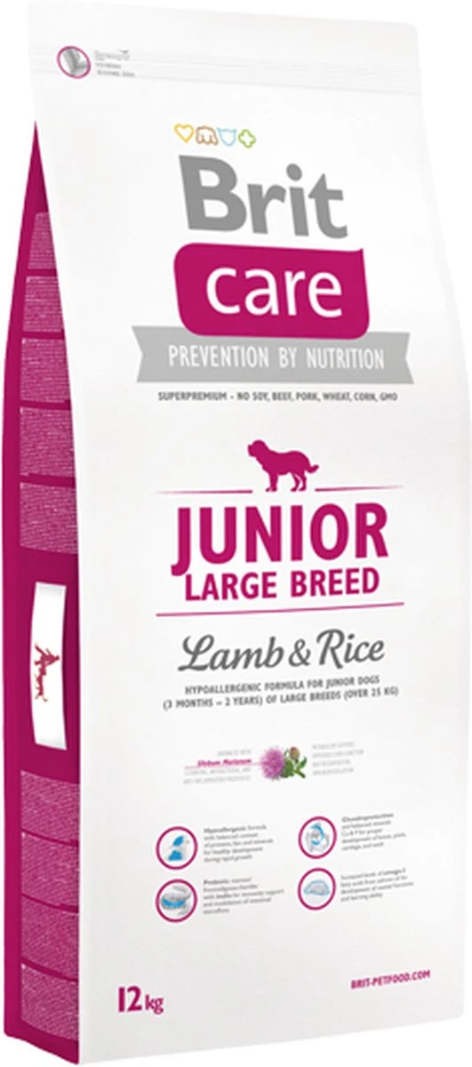 Brit Care Junior Large Breed Lam&Rijst is een hypo-allergene voeding voor jonge honden (3 maanden tot 2 jaar) van het grote ras (> 25kg).