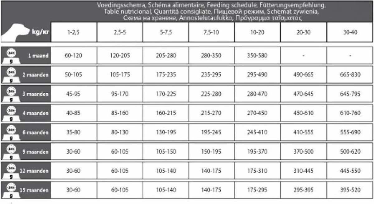 Puppyโs van grote rassen groeien door tot 15 maanden. Schakel na 15 maanden geleidelijk over naar CaroCroc Large Breed.