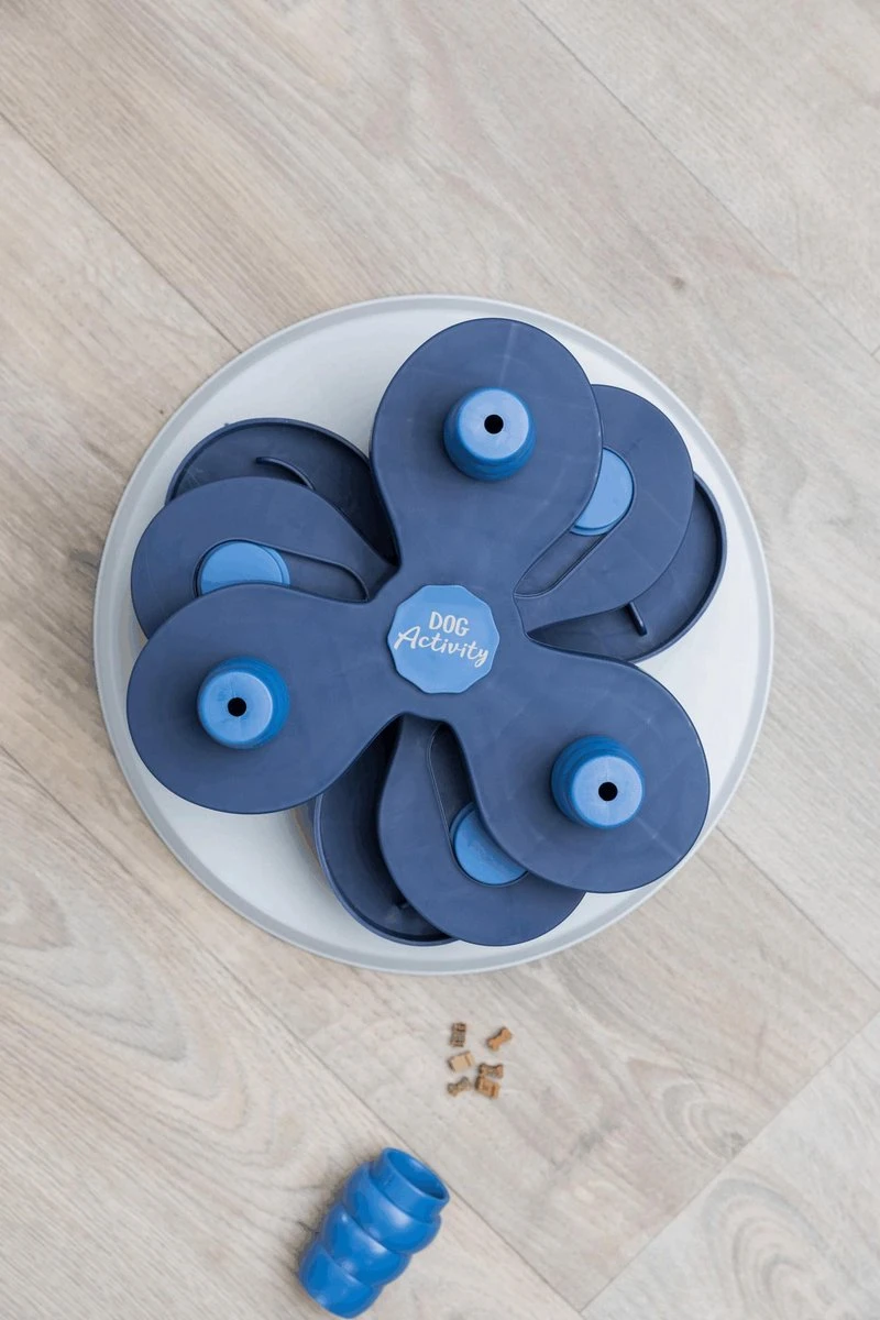 Het Trixie Dog Activity Intelligentiespel Flower Tower van 30 x 30 x 13 cm is een uitdagend intelligentiespel voor de gevorderde hond. Het spel is voorzien van kommetjes en schuifdeksels op verschillende niveaus, alsook zes kegels die omgeduwd kunnen worden om er eten onder te vinden. Door verschillende openingstechnieken komt de hond bij zijn beloning. Dit biedt mentale uitdaging en gaat verveling tegen. Door de rubberen ring is het speelgoed slipvast en kan jouw hond ongestoord op zoek naar zijn beloning! Het spel komt bovendien met een handleiding met tips en handigheidjes voor een optimale training.