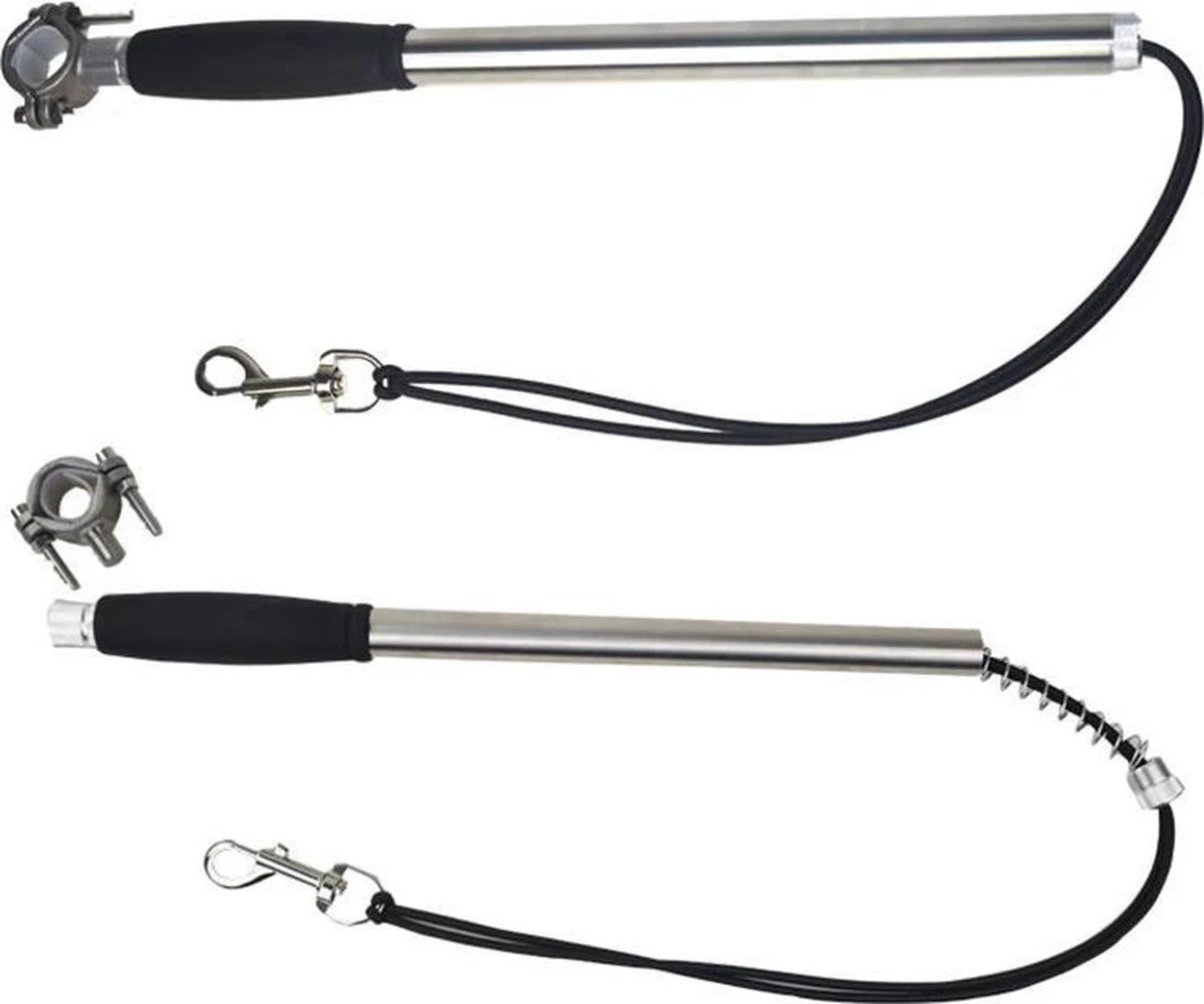 Je monteert de zet aan de zadelpen van je fiets en de stang steekt iets uit, zo blijft je hond altijd op gepaste afstand naast je lopen aan de juiste kant van de weg. Uiteraard zal de set de fiets zelf niet beschadigen. De fiets set zorgt er onder andere voor dat rukkend trekken door je hond wordt getemperd dankzij de stabiele vee