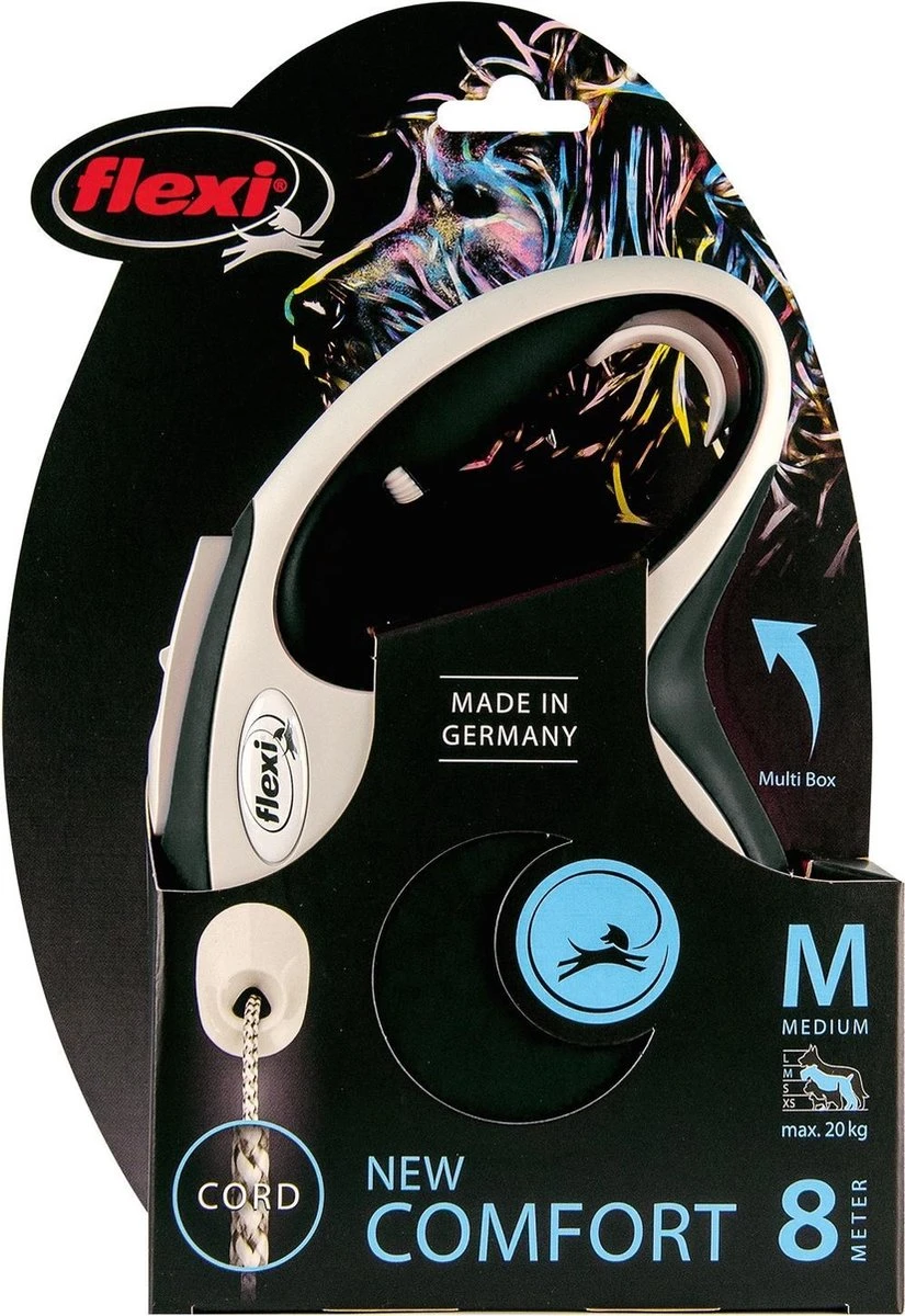 Bij Flexi kan je kiezen tussen lijnen met een koord en lijnen met tape. Het is een persoonlijke voorkeur welke variant je het fijnst vindt. In principe zijn beide soorten even sterk en veilig om te gebruiken. De New Comfort Cord bevat een koord.