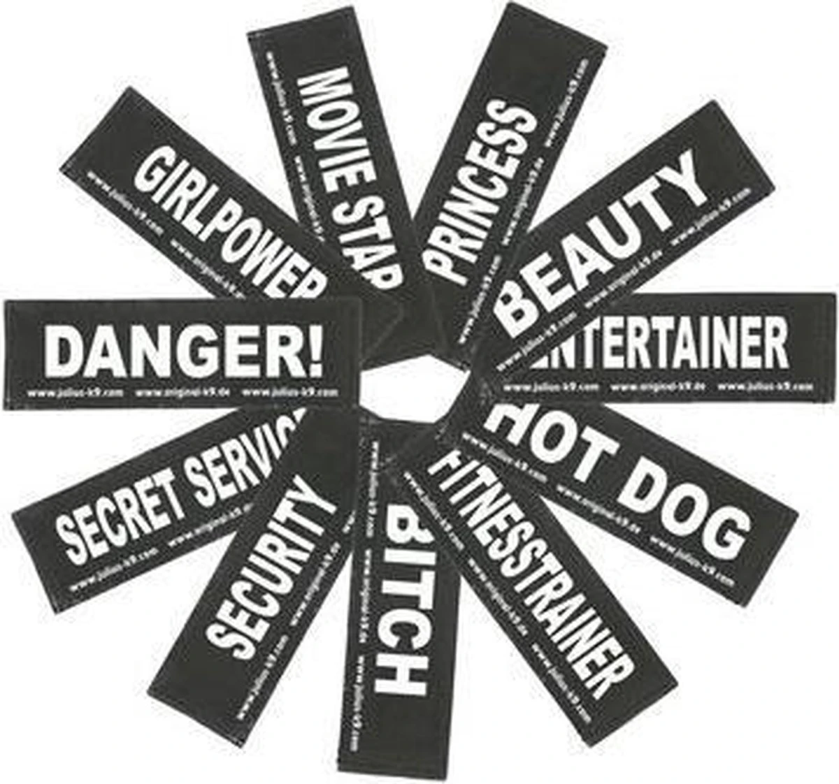 Voor elke gelegenheid een andere tekst. De tekstlabels bevestigd u aan de zijkanten van de K9 IDC Survival tuig doormiddel van klitteband. Aan elke kant van het tuig is een speciale plaats waar ze op bevestigd worden. Voor 1 tuig heeft u 2 labels nodig (1x op de linkerkant en 1x op de rechterkant). De labels worden PER SET verkocht. Dus PER SET van 2.
