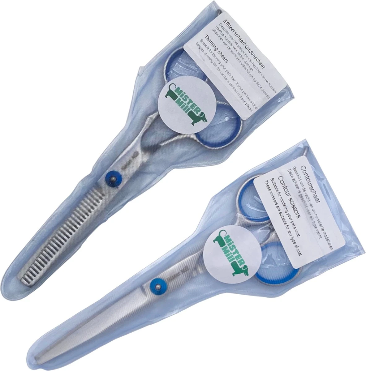 Bespaar geld op het bezoeken van de trimsalon, het bijknippen van je huisdier doe je gewoon zelf. Met deze professionele RVS Scharenset: Effileerschaar enkelzijdig + Contourschaar.