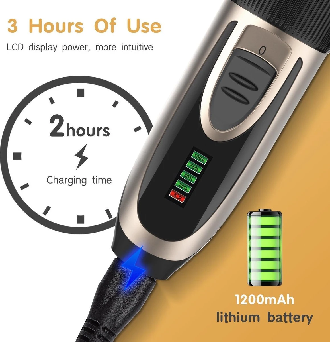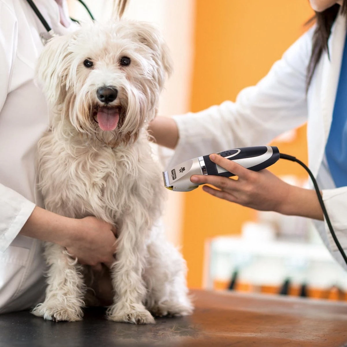 Professionele dieren trimset inclusief afstandhouders, vachtschaar en kam. Meer heb je niet nodig om de vacht van je hond of kat te trimmen. Een mooi afgewerkt draadloze uitvoering. Deze maakt weinig geluid waardoor je huisdier minder angst zal ervaren. De tondeuse is zonder opzetstuk in te stellen vanaf 0,8 t/m 2 mm. De vier opzetstukken variรซren van 3 mm t/m 12 mm. Bij geheel lege accu is er slechts 2 uur nodig om de tondeuse 100% op te laden.
