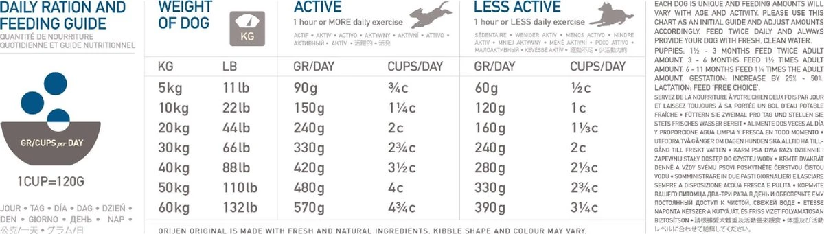 Orijen Whole Prey Original Dog 17 kgDe Orijen Whole Prey Original Dog 17 kg complete hondenvoeding is hondenvoer rijk aan scharrelkip en kalkoen, in het wild gevangen vis en scharreleieren in WholePrey verhoudingen. De natuurlijke voeding van Orijen bevat een ongeรซvenaarde variatie aan vers vlees en verse vis. Het wordt bereid met 85% dierlijke ingrediรซnten en is 100% natuurlijk. Deze brokken bevatten hoogwaardige voedingsstoffen in de meest verse, natuurlijke en voedzame vorm. Maar liefst twee derde van het vlees, vis, gevogelte en eieren is vers of rauw.Volledig diervoeder voor honden. – Volledige hondenvoeding van Orijen- Met natuurlijke en verse ingrediรซnten- In Whole Prey verhoudingenInhoud: 17 kgSamenstelling:Vers kippenvlees (13%), Vers kalkoenvlees (7%), Verse hele eieren (7%), Verse kippenlevertjes (6%), Verse hele haring (6%), Verse Pacifische Pijltandheilbot (5%), Verse kalkoenlever (5%),