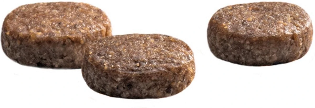 | Voedingswaarde | Gedehydreerde kip (24%), tarwe, sorghum, mais, dierlijke vetten (gevogelte), maisgluten, bietenpulp, gehydrolyseerde kippenlever, lignocellulose, zalmolie (0.6%), gist, mineralen (kaliumchloride), inuline (0.3%), kruidenextracten & Schรผssler celzouten (siberean ginseng, cornu cervi degelatinatum, morus fruit, mume, cnidium, cyperus, polygonatum, Schรผssler celzouten nr. 1, 2, 5, 7) (0.085%), glucosamine (500mg), chondroitine (500mg). |