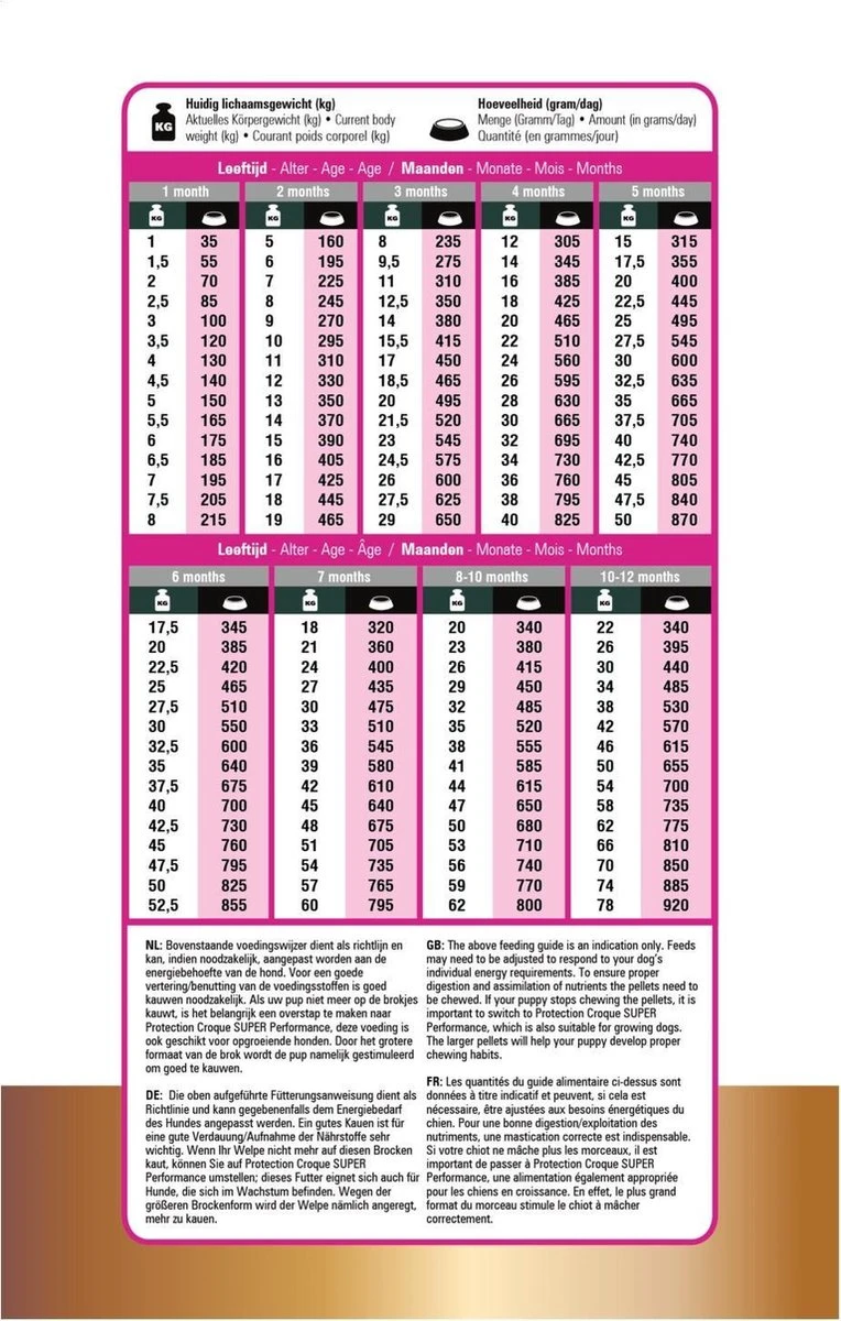 | Voedingsadvies | Prins Protection Croque Junior Performance kan droog gegeven worden. bereiding is niet nodig. Zorg wel dat er altijd vers drinkwater op kamertemperatuur klaar staat voor je hond. Verdeel de dagportie over minimaal twee maaltijden per dag. |