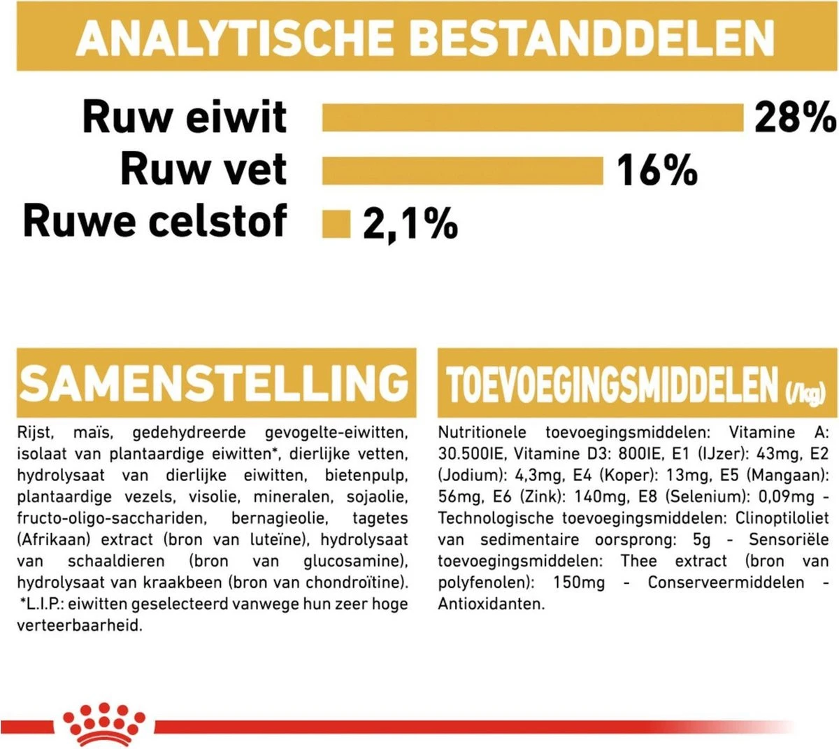 Rijst, maïs, gedehydreerd gevogeltevlees, isolaat van plantaardige eiwitten*, dierlijke vetten, hydrolysaat van dierlijke eiwitten, bietenpulp, plantaardige vezels, mineralen, plantaardige oliën (sojaolie,bernagieolie), visolie, Fructo-Oligo-Sacchariden, natriumpolyfosfaat, taurine, DL-methionine, L-tyrosine, hydrolysaat van schaaldieren (bron van glucosamine), extracten uit groene thee en druiven (bron van polyfenolen), L-carnitine, Tagetes (Afrikaan) extract (bron van luteïne), hydrolysaat van kraakbeen (bron van chondroïtine).
