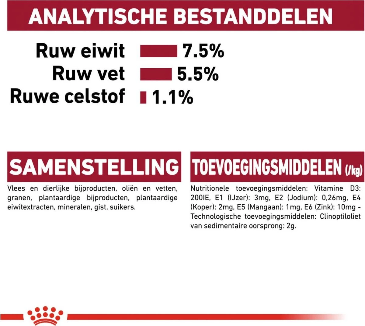 | Voedingswaarde | Samenstelling: vlees en dierlijke bijproducten, oliรซn en vetten, granen, plantaardige bijproducten, plantaardige eiwitextracten, mineralen, gist,suikers. |