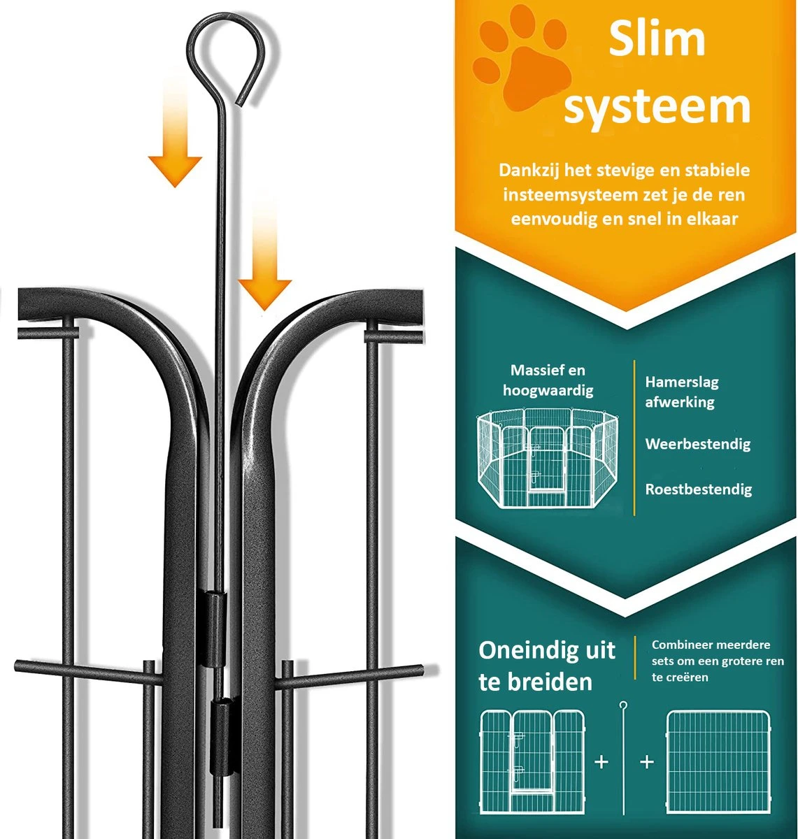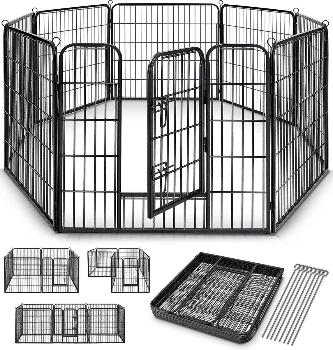 Deze ren is gemaakt van hoogwaardige materialen en massief metaal. De hamerslag-lak waarmee de ren is afgewerkt, zorgt ervoor dat de ren roest- en weerbestendig is, waardoor je deze zowel binnen als buiten kunt gebruiken. Natuurlijk is de ren BPA-vrij en dus veilig voor je huisdier. De ren is in 4 basis vormen op te zetten en oneindig uit te breiden wanneer je meerdere sets combineert. Dankzij het slimme steek-systeem zet je deze ren op in een mum van tijd en is deze ook zo weer uit elkaar gehaald. De panelen kun je opstapelen en ruimtebesparend opbergen wanneer je de ren niet gebruikt. Dankzij de fijne mazen is deze bench ook zeer geschikt voor andere dieren zoals katten, konijnen, cavia’s en meer.