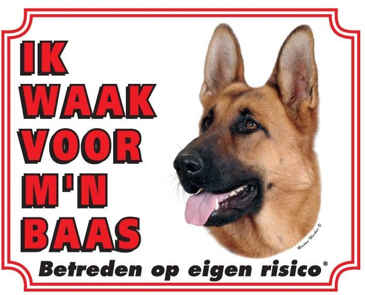 Ik waak voor mijn baas waakbord met afbeelding van de Duitse Herder.Het waakbord is gemaakt van Polystreen.Afmetingen 25 x 20 x 0,1 cm.Laat onbevoegden weten met dit waakbord dat er een Duitse Herder aanwezig is. Het bord heeft een witte achtergrond met een opdruk en is gemakkelijk te bevestigen door middel van de gaatjes aan de zijkanten.